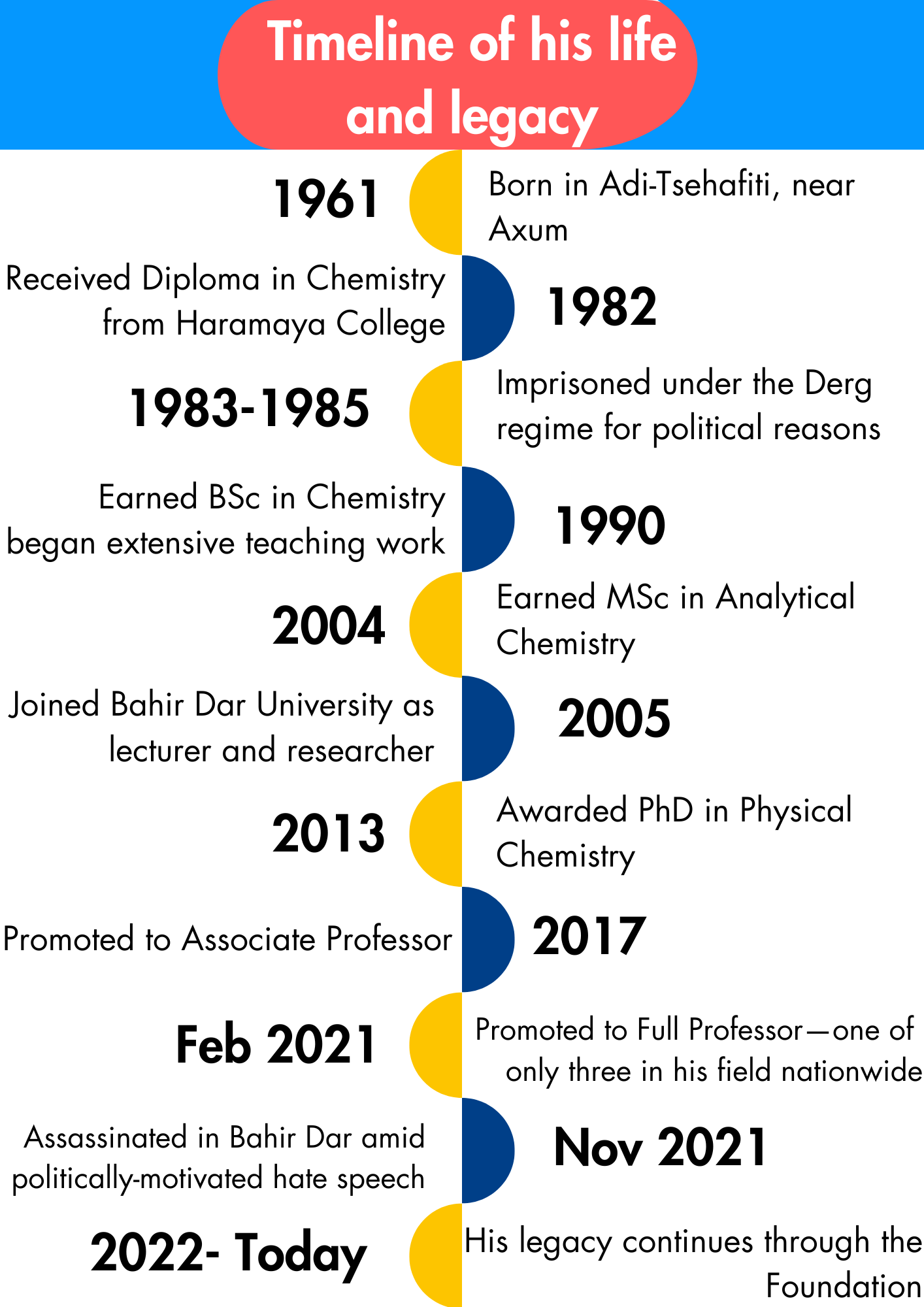 His early academic path took him from Abreha Atsbeha Elementary to Addis Ababa University, where he earned his BSc, MSc, and eventually, a Ph.D. in Physical Chemistry. His professional life was marked by dedication—teaching and mentoring students, managing the university’s science laboratories, publishing over 47 research papers, and authoring textbooks that shaped chemistry education in Ethiopia.